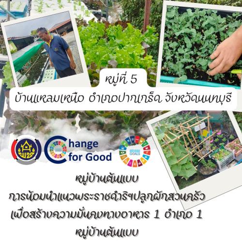 สำนักงานพัฒนาชุมชนอำเภอปากเกร็ด จังหวัดนนทบุรี ขับเคลื่อนโครงการ “1 อำเภอ 1 หมู่บ้านต้นแบบ” ส่งเสริมการน้อมนำแนวพระราชดำริฯ ปลูกผักสวนครัว เพื่อสร้างความมั่นคงทางอาหารอย่างยั่งยืน โดยมุ่งเน้นให้ครัวเรือนในชุมชนปลูกผักสวนครัวไว้บริโภคในครัวเรือน ลดรายจ่าย เพิ่มรายได้ และเสริมสร้างความเข้มแข็งให้กับชุมชน สามารถพึ่งพาตนเองได้อย่างมั่นคงและยั่งยืน