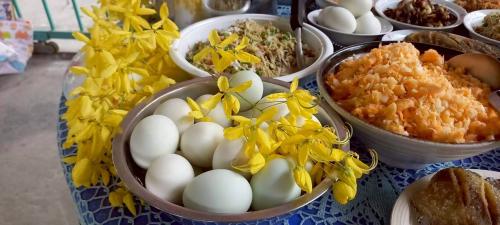 ภายหลังการฝึกปฏิบัติทำข้าวแช่ยังได้มีการจัดวางเครื่องสักการะ “ข้าวแช่” อย่างประณีต พร้อมประดับด้วยดอกพูน เพื่อใช้บูชาเทพีสงกรานต์ อันเป็นการสืบสานขนบธรรมเนียมประเพณีไทยควบคู่ไปกับการพัฒนาอาชีพ ซึ่งพิธีบูชาเทพีสงกรานต์เป็นความเชื่อดั้งเดิมของไทยที่จัดขึ้นเพื่อความเป็นสิริมงคลต้อนรับปีใหม่ไทย โดยนิยมจัดเครื่องบูชา เช่น อาหารคาวหวาน น้ำอบ ดอกไม้ และธูปเทียน พร้อมทั้งตั้งจิตอธิษฐานขอพรให้เกิดความร่มเย็นเป็นสุข ความเจริญรุ่งเรือง และความอุดมสมบูรณ์ตลอดปี